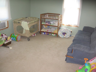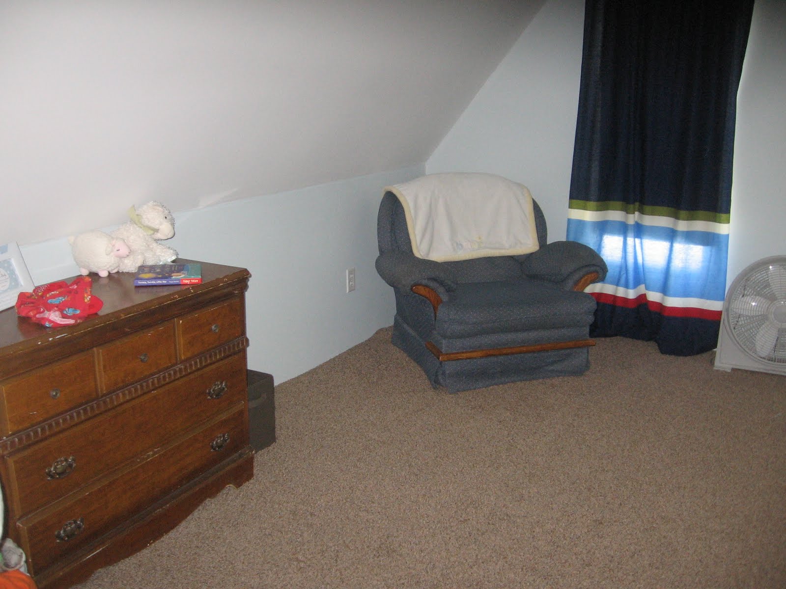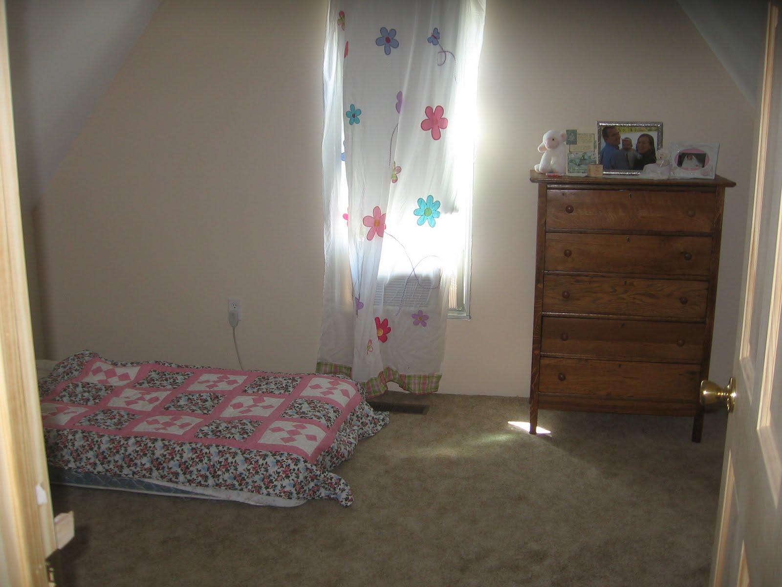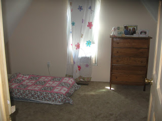 She has a nice sized closet to the left. The carpet is the same remnant from my grandparents' house. You can read about how we acquired it here. And actually, you should check out that link. It'll refresh your memory on what the upstairs used to look like. For instance, this room was the kitchen. :)