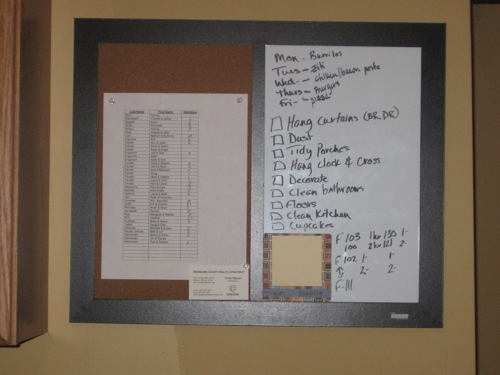 #1 - kept a running list on the kitchen white board of all the things we need to do. This is the second list, by the way. We accomplished all the tasks that were first listed here.
