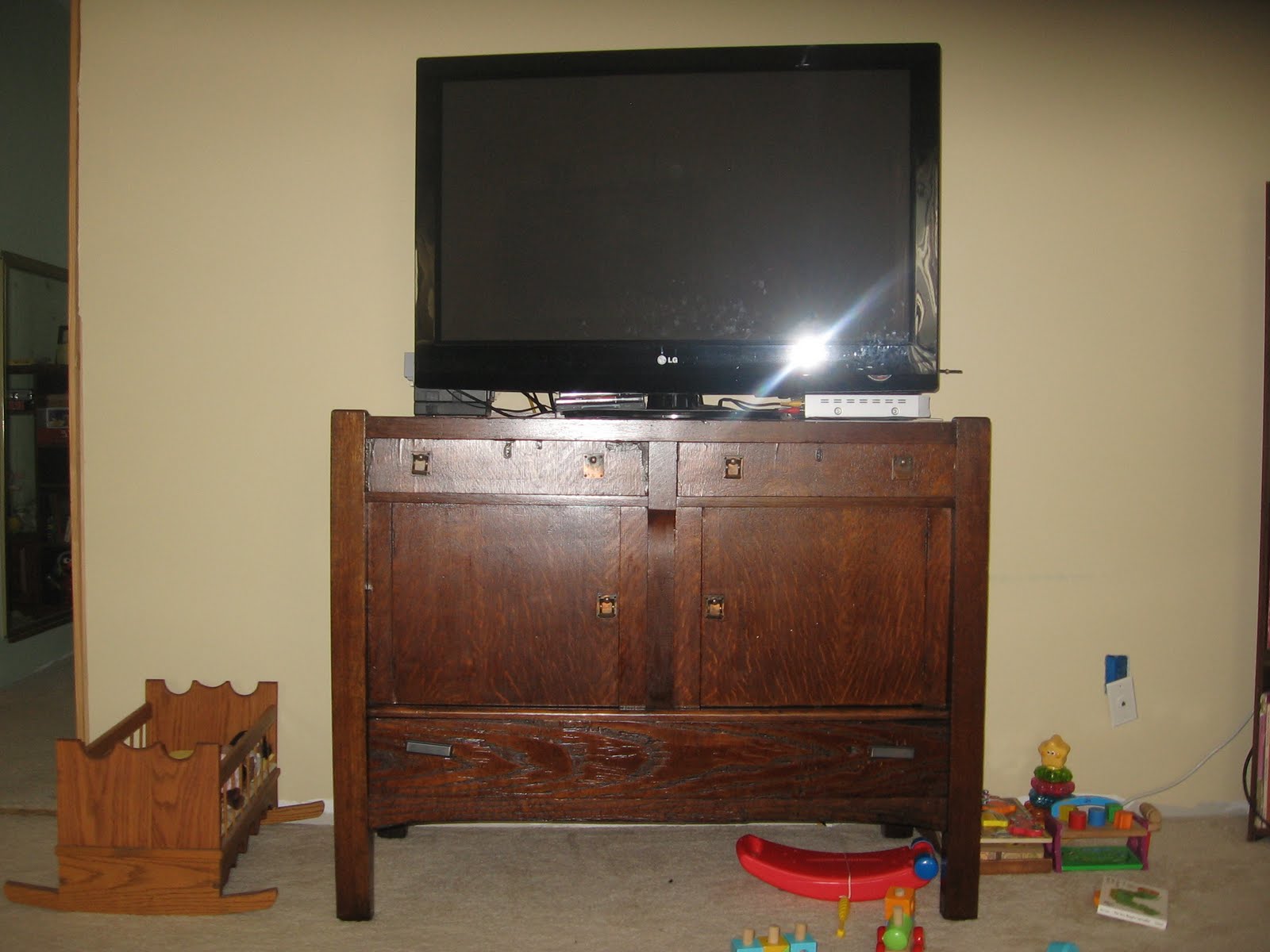 #2 - Mom stained and prettied up this old buffet. It sat in their basement for years, beat up and covered in junk. I love this thing because it a) makes our embarrassingly large tv look smaller b) holds and hides all our vhs tapes and dvds c) has drawers that are too hard for the kids to open - thus they are filled with all kinds of things I don't want them messing with, and a lot of junk that I don't want you to see.