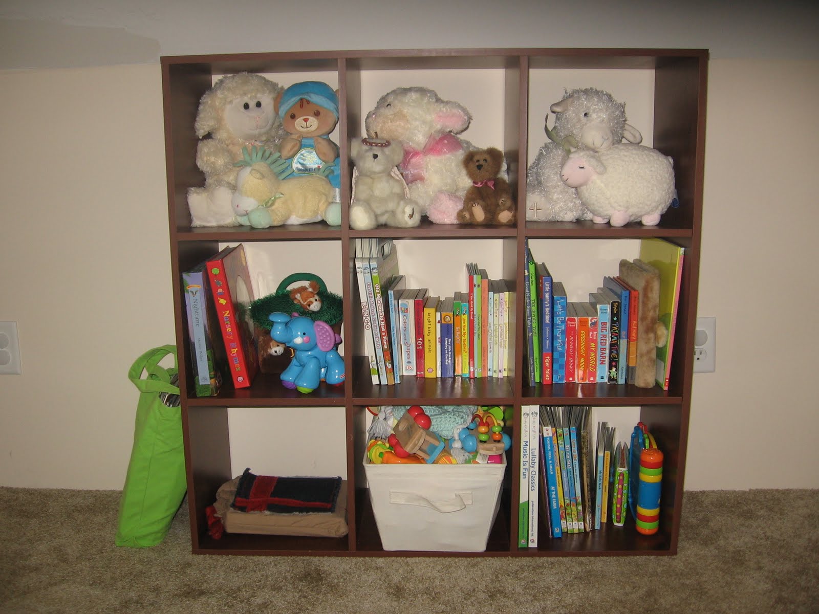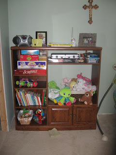 #6 - We moved the entertainment center out of the dining room and into the nursery / playroom. We took the glass door off the left side and housed the "fun" and educational books and toys here. This is the best the entertainment center has looked in a looooong time.