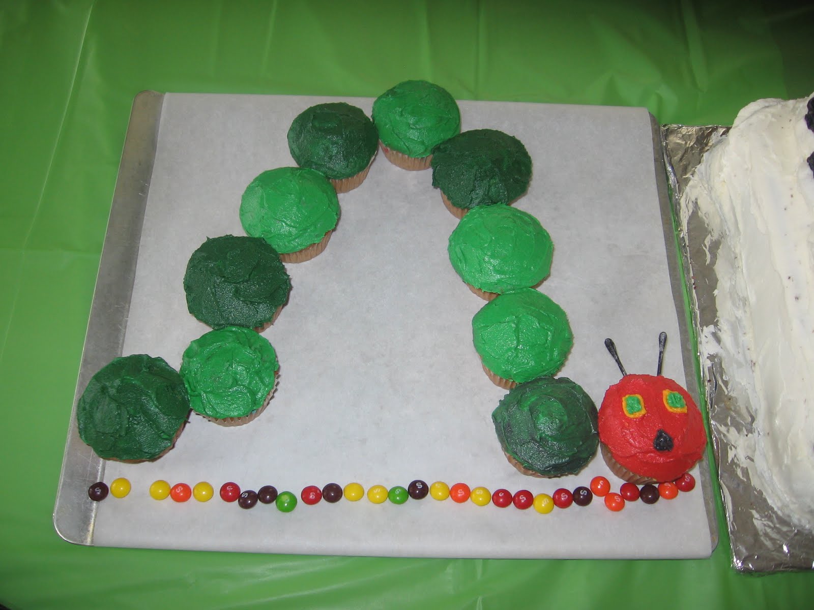 The VHC ate through a cupcake - I made a funfetti cupcake caterpillar. This was inspired by different cupcake caterpillars I found online. The Skittles are supposed to mimic the colorful dots on the title page of the book.