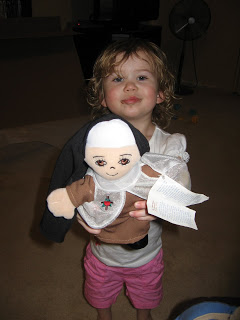 A few weeks ago she was holding St. Therese, cuddling with her and giving her a bottle. Then she went into the playroom, the Little Flower in hand, and after a moment came back out alone, shutting the door behind her.