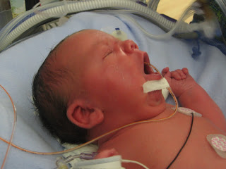 Today they took his cannula (that's the oxygen in the nose thingy) off of him. Really he took it off himself, pulling it down and breathing perfectly well all on his own. This is a big change for a boy - and his parents - who we thought might never breathe on his own.