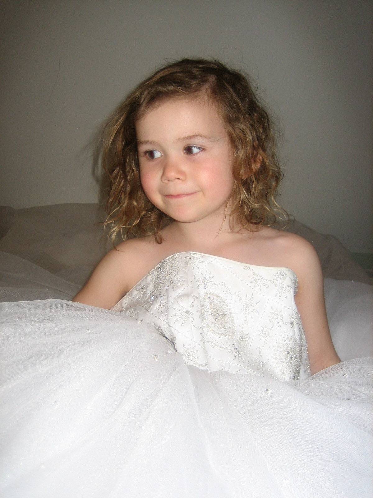 3 - On Pinterest I saw the suggestion to take a picture of your daughter in your wedding dress so it can be displayed at her wedding. Of course the picture on Pinterest showed a little girl with styled hair and good lighting, probably sitting in a portrait studio. This is L at the end of the day, sitting on my bed. But it doesn't really matter. She looked beautiful in the dress and I was delighted when she told me she would wear it on her own wedding day. (I seriously love that dress so much that until I could no longer fit in it I would wear it around the house, talking on the phone, watching tv, whatever. Love it.)