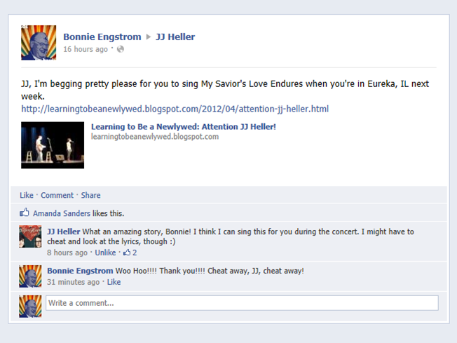 6 - So on Twitter, Facebook, and this blog I pleaded with JJ Heller to please sing her song My Savior's Love Endures when she is in Eureka next Friday for a concert. The song means a lot to me as I sang it over JF when he was in the NICU.