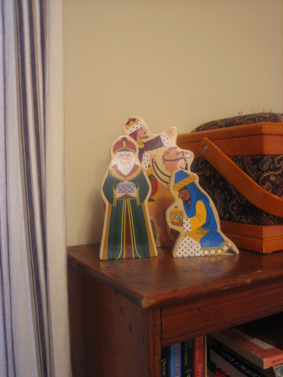 Wise men from the Nativity, beginning their journey from the Far East of the living room.