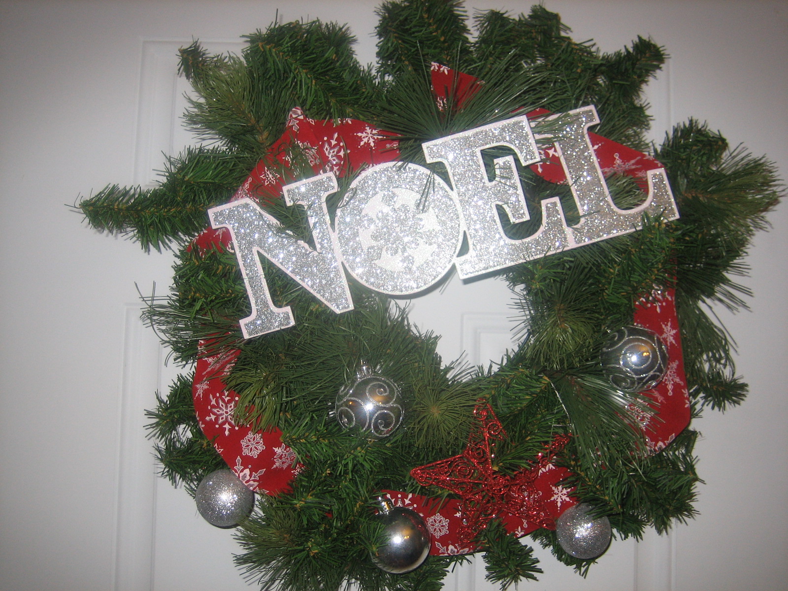 I just re-did this with some new ribbon and the Noel from Wal-Mart. The ornaments and greens are left from my wedding decorations, which makes it extra special to me.