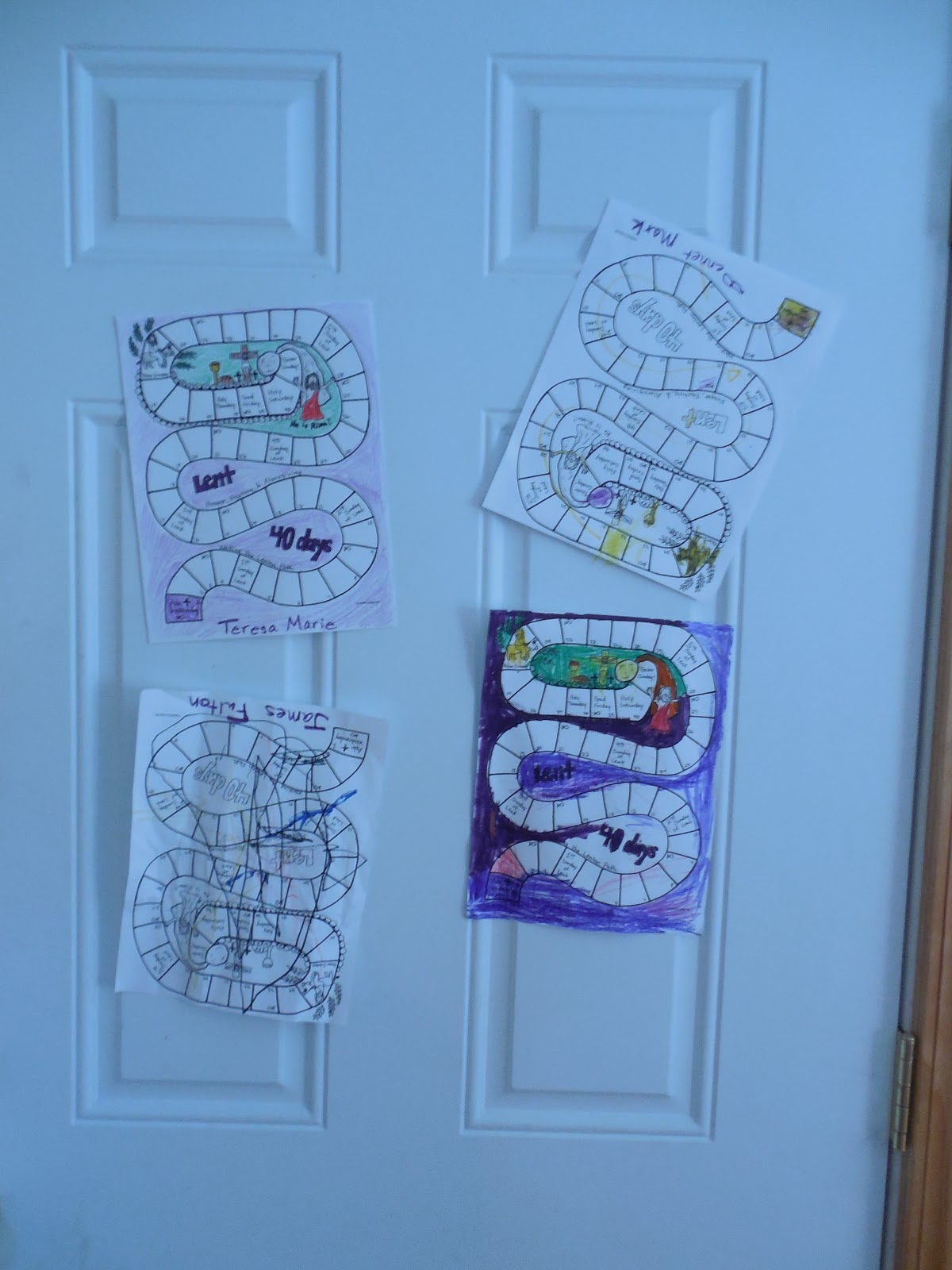 Our Lenten calendars from Catholic Icing. They definitely help the kids understand how long Lent is and when we'll be celebrating Easter. I love these things.