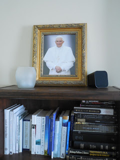 Our Holy Father, hanging out with books, because he loves books. Especially How Green Was My Valley, The Bourne Identity, and David Sedaris' Naked.