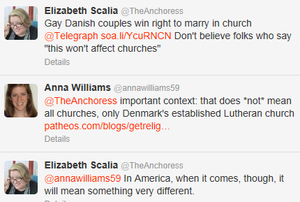 Then I saw the following conversation on Twitter about news from Denmark that all Lutheran churches must now allow homosexual couples to marry because of a newly passed law.
