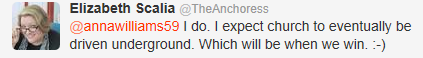 The Roman Catholic Church will never, ever witness the wedding of a same sex couple. It will not rent its churches or halls out to same sex couples for weddings and receptions. Same for marriages of people who are divorced or who are going to have an open marriage or who will use a form of contraception to never have kids*. This is not because we're a bunch of hateful bigots but because we would see it as a lie, a sham, going against what marriage really actually is. And so I wonder if what Elizabeth Scalia says will actually happen - if we will be driven underground. If it does happen I do not look forward to it, but I do think it might be just the kind of suffering and separating of the chaff and wheat that we need.