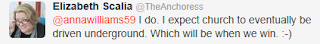 ReplyDeleteIncidently, as for hiding underground and Elizabeth Scalia, the only reason the Danish government was able to order the Lutheran churches to allow same-sex unions is that in Denmark, Lutheranism is the STATE religion - declared so in their constitution. As a result, their government is able to have their hand directly in the church's decisions & practices (in fact, the Danish Lutheran church is required to have a member of the royal family must "be a member of the established church". So take some heart from that, that at least we don't have a senator acting as a Bishop or something. ;)