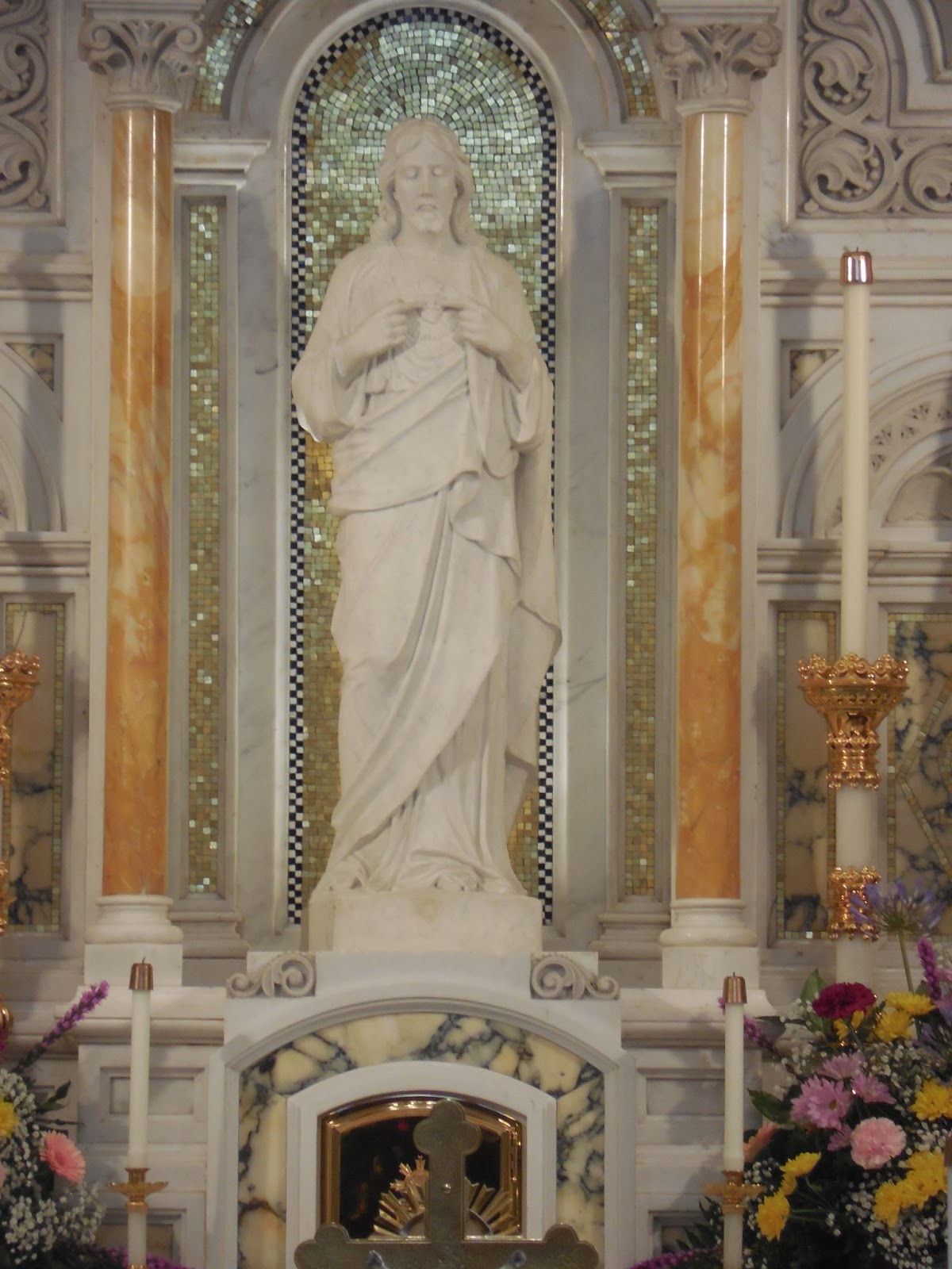 Close up of the Sacred Heart statue above the tabernacle.