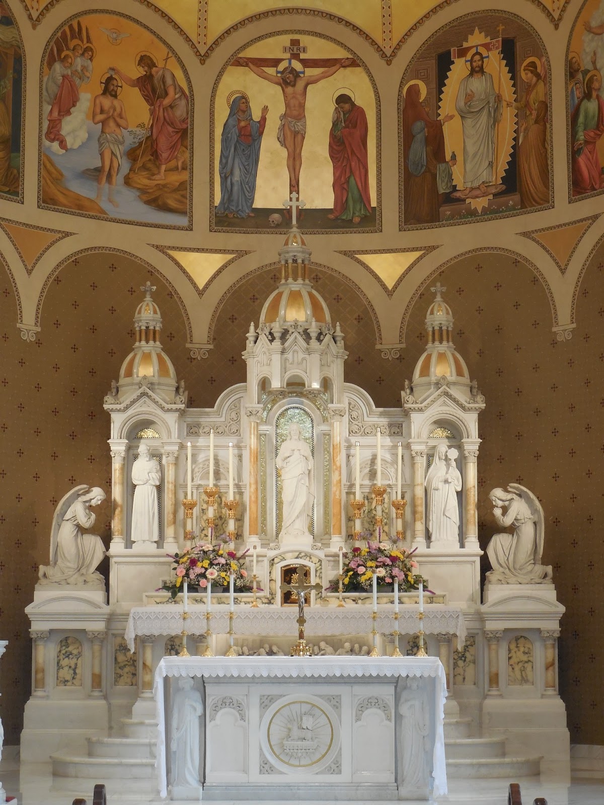 The frescoes above and around the altar (there's actually two altars - the table-like one in the front where Mass is celebrated and the Main or High Altar which is the tall beautiful one against the back wall. It houses the tabernacle - which is where consecrated hosts, aka the Eucharist, aka Jesus [John 6:25-68] are located.) show all the major events in the life of Christ. Above the side altars (not shown), and adding to the story, are frescoes of the Annunciation (When the angel told Mary she would bare the Son of God) and Pentecost (When the Holy Spirit came down on Mary, the Apostles, and others as they were gathered in the upper room, after Jesus had ascended back to Heaven.) on the far left and right, respectively.