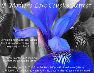 If you have lost a child during pregnancy or infancy I encourage you to attend the A Mother's Love retreat on Saturday, July 27th at St. Philomena's in Peoria, IL. Meals are provided, it is open to couples and is free of charge. Please register with RyAnne by emailing [email protected]. Also, please note that while it is done from a Catholic perspective it is open to parents of all faith backgrounds. You can also find more information at RyAnne's blog, Good Grief!