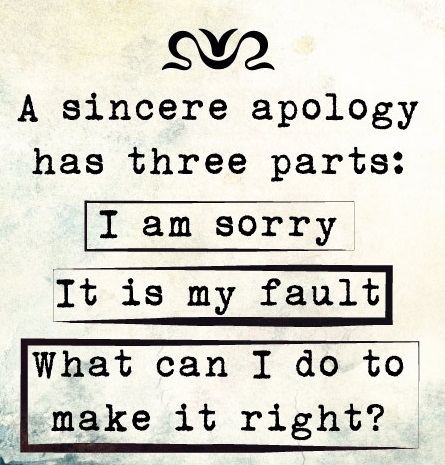 is a lesson I learned from the executive director of the Behold Conference. Not that she ever sat down and told me, "Bonnie, this is what a mature, adult, sincere apology looks like: I'm sorry; it's my fault; what can I do to make it right?" but she did model it for me over and over again. When she apologized to me, when she helped me "script" conversations I'd need to have with others, when she apologized to others she always said some variation of those three things. Even when her fault was tiny compared to the fault of the other. Even when the other never apologized back.