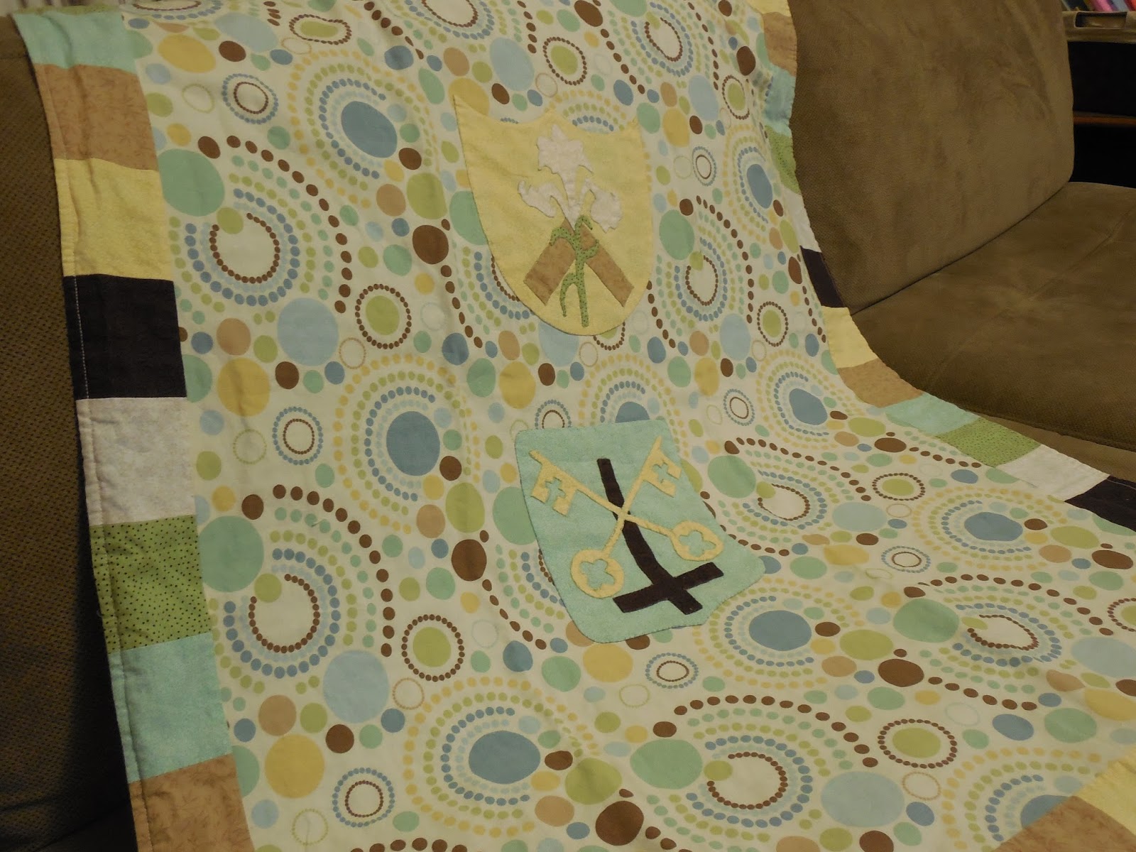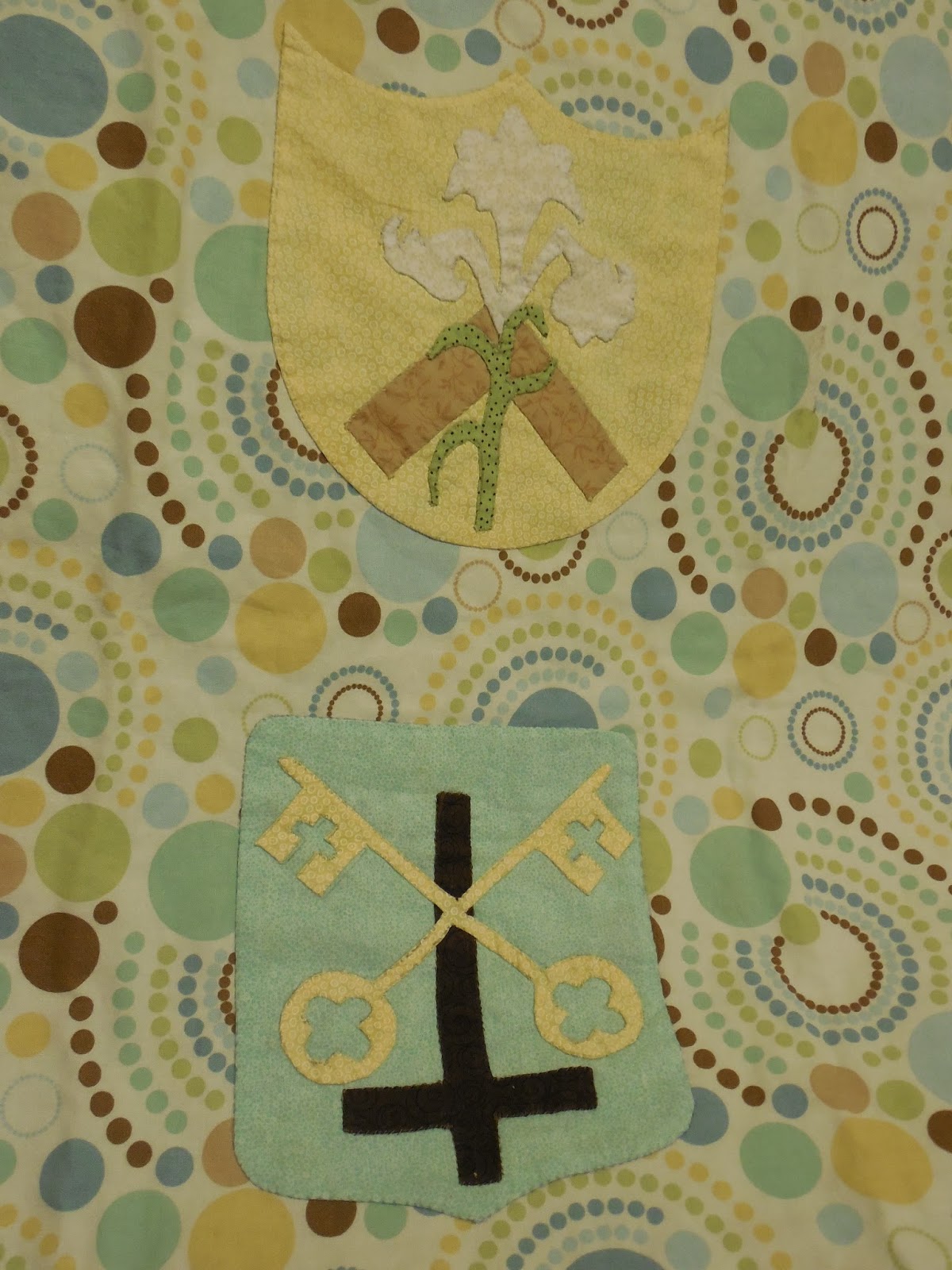 Now, folks, let me tell you that Kendra was also super generous. She brought us some meals and made a blanket for JP. It has has the crests / symbols for both of JP's namesakes. The lily and square for St. Joseph and the keys to the Kingdom and the upside down cross for St. Peter. Isn't it lovely?