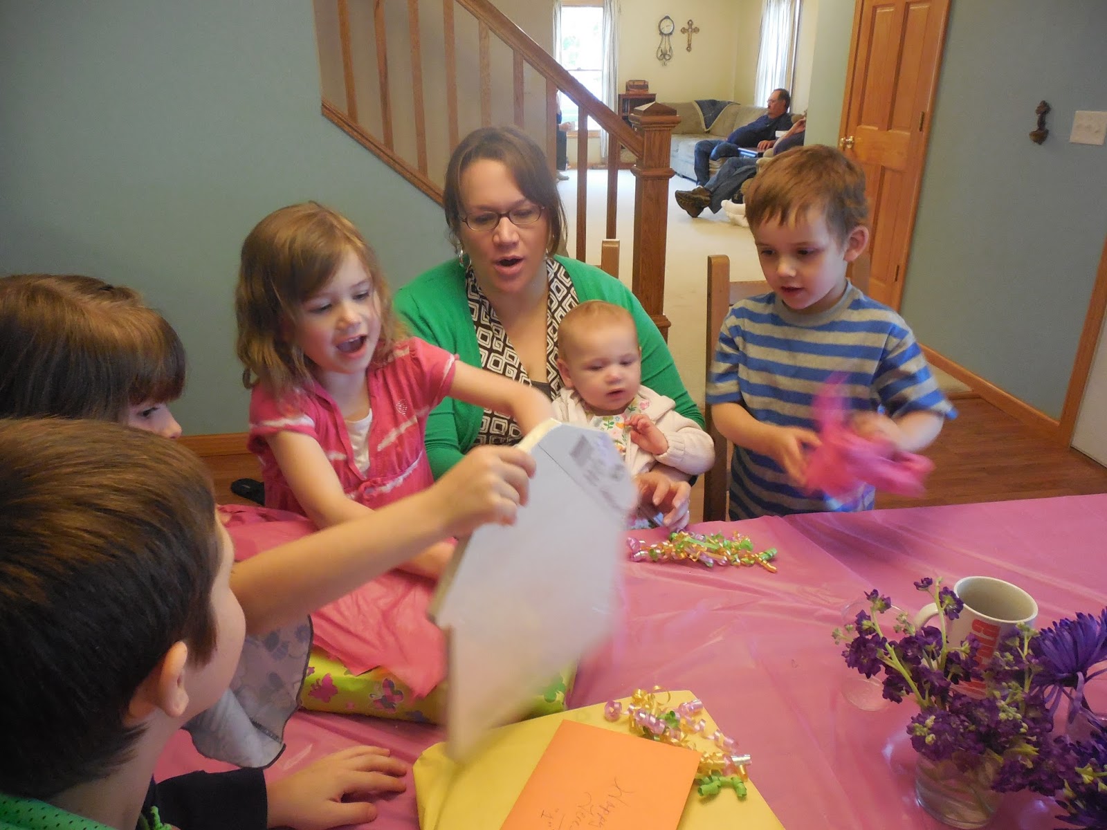 The grandpas sat in the living room watching a movie and her siblings swooped in to help open gifts.