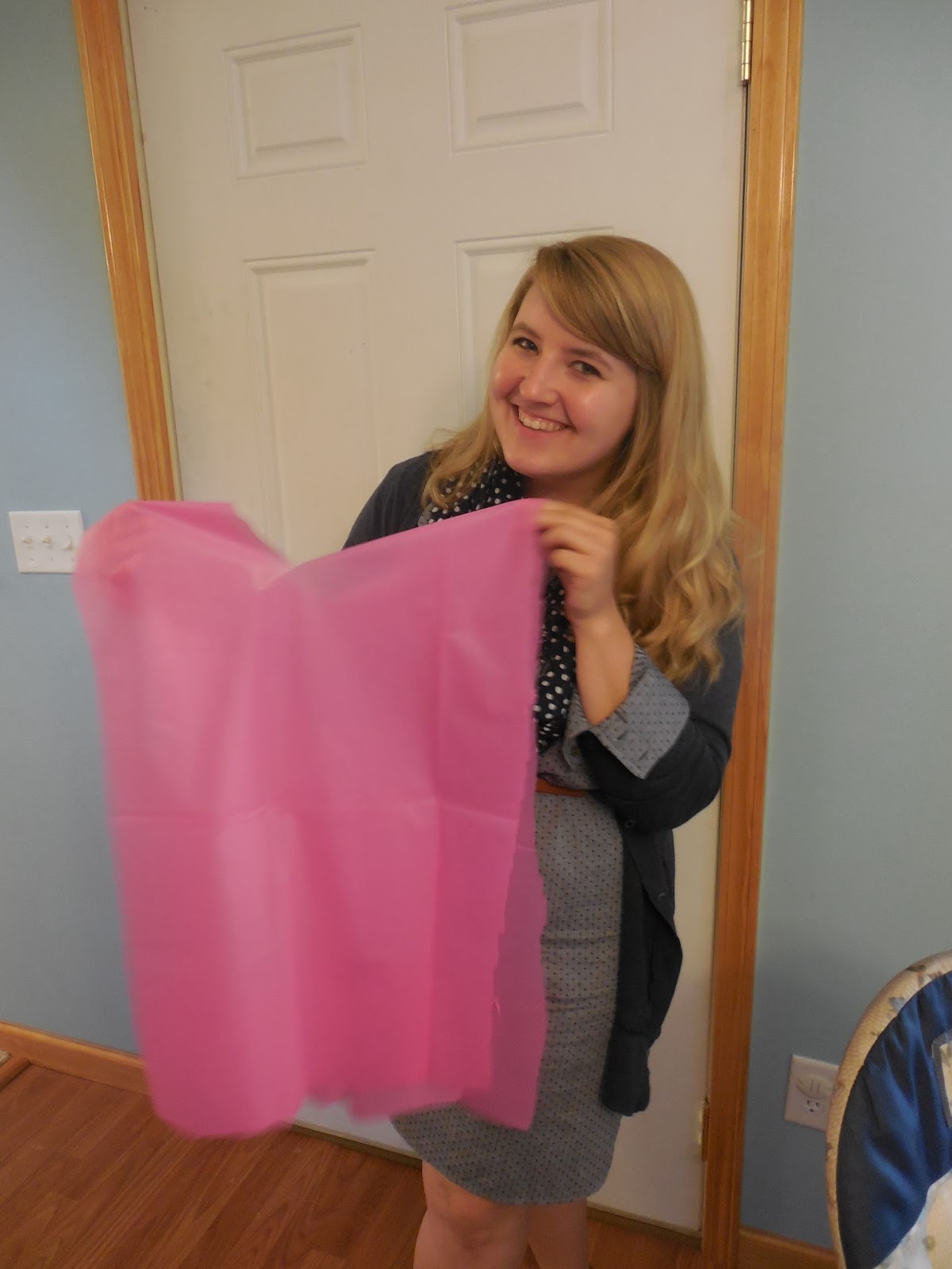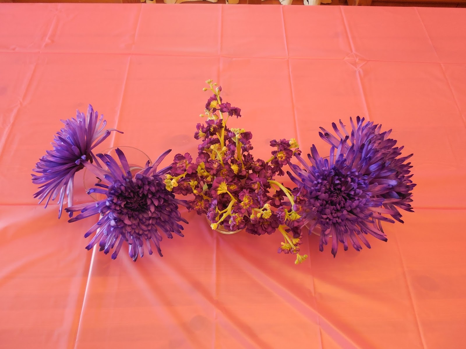 Not sure why the coloring is so weird in this picture but for a simple and easy decoration I put down a pink, plastic tablecloth and some purple flowers.