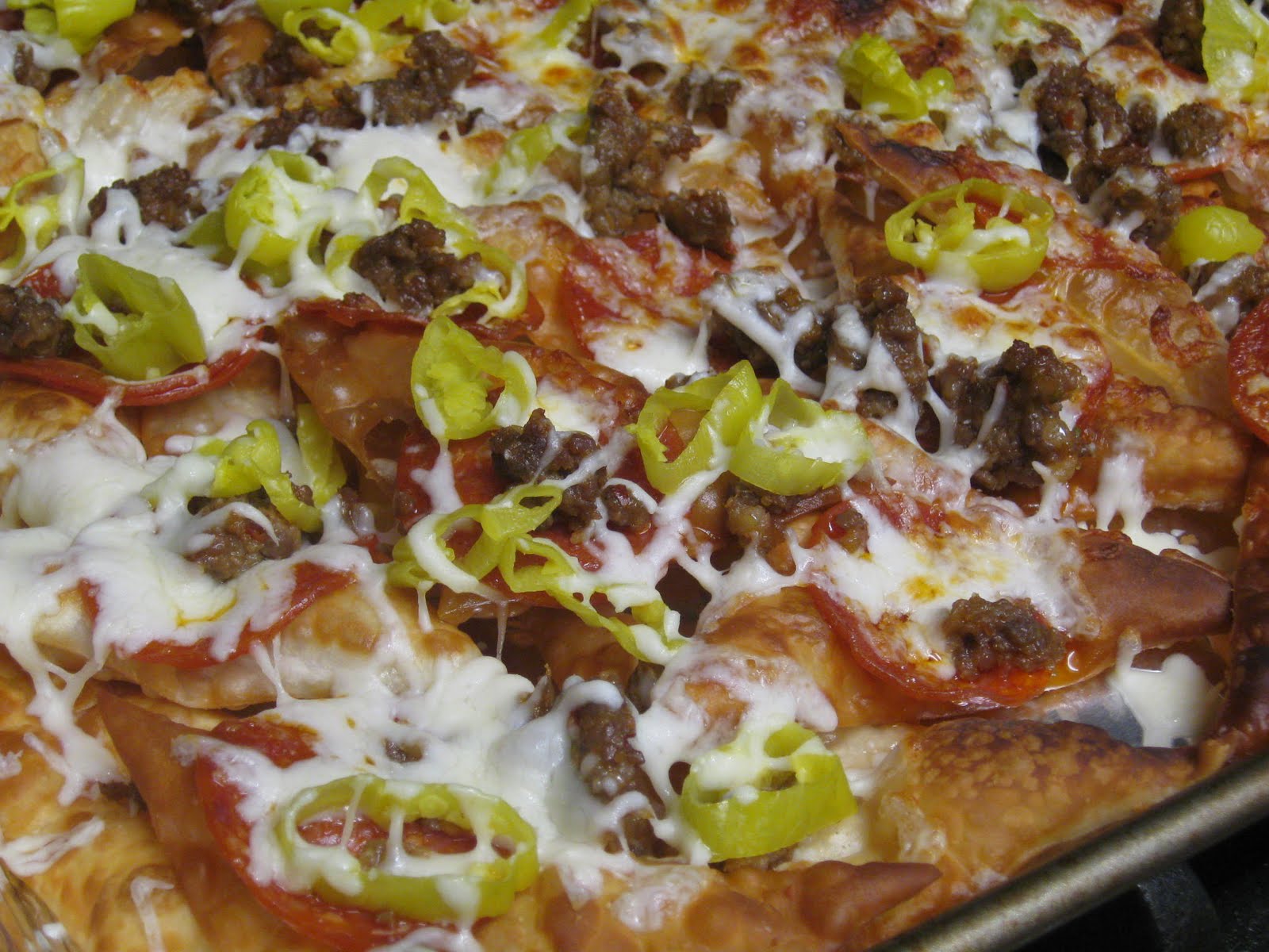 Line a baking sheet with foil and cover with tortilla chips. Place pepperonis, cooked Italian sausage, mozzarella cheese, and pepperocinis on top. Warm in oven until cheese is melted. Devour.