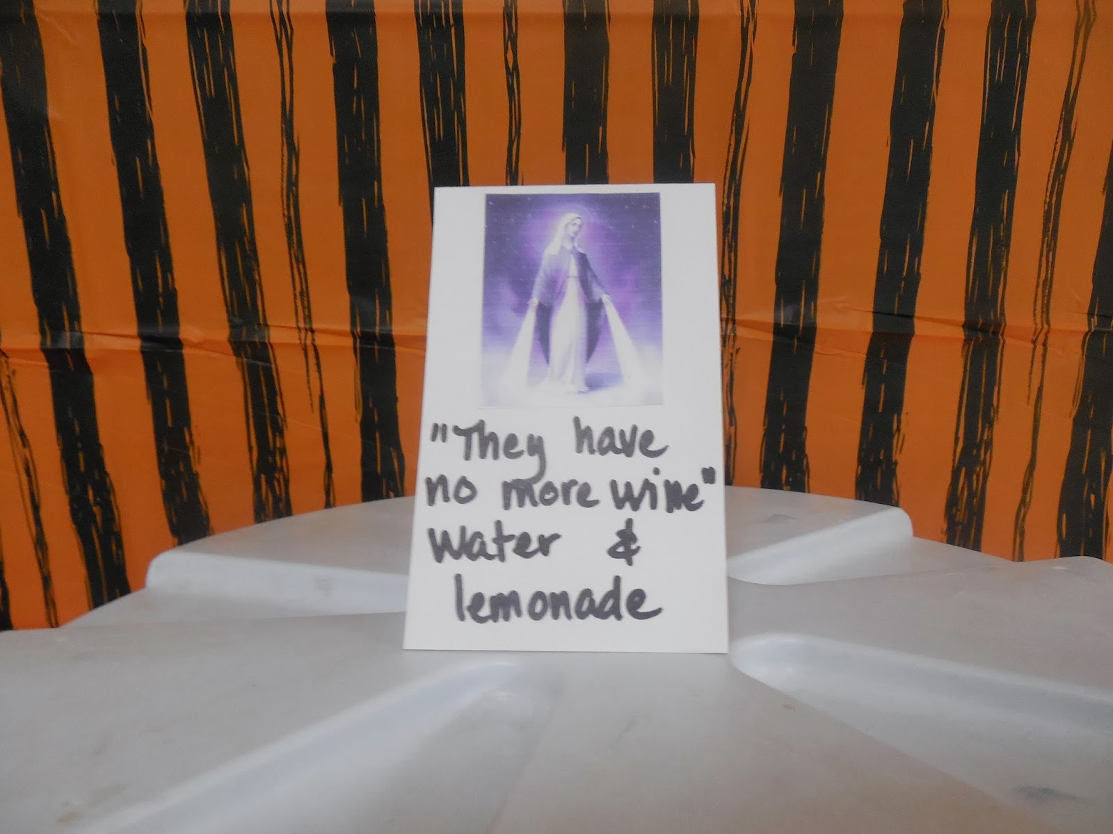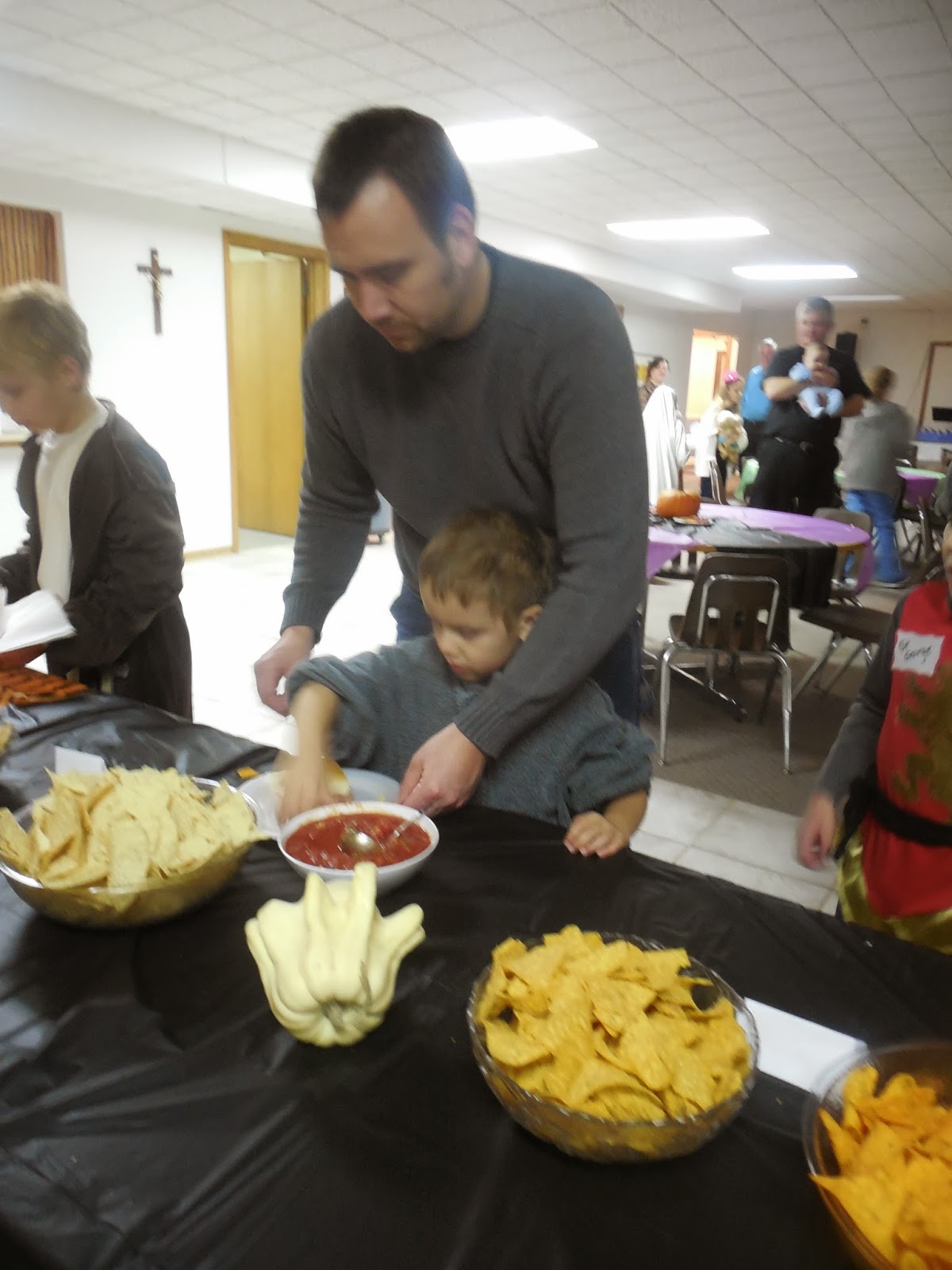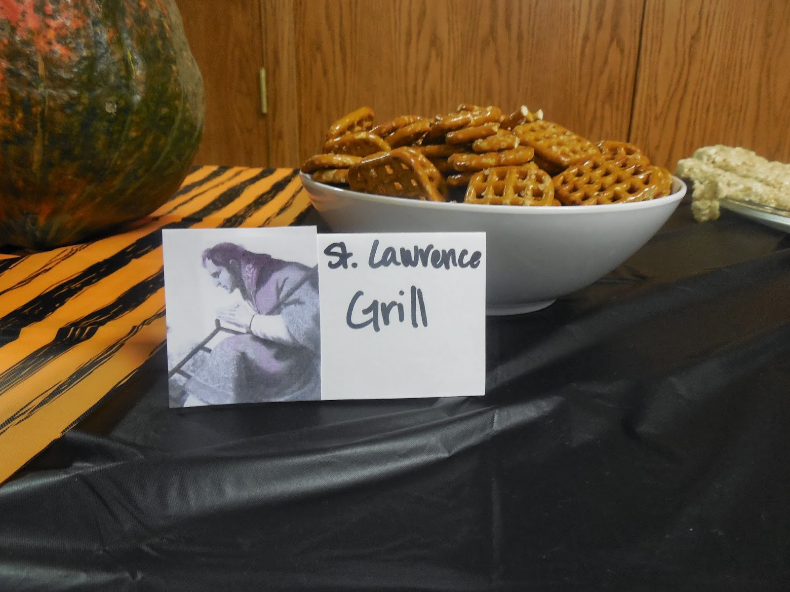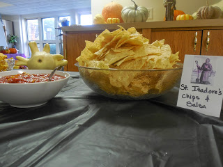 More plastic tablecloths, donated pumpkins, and lots of good food. Each dish was labeled with a tented piece of cardstock that included an image of the saint. I am not very good with graphic-y things and so the labels were a little on the lame side but they got the job done.