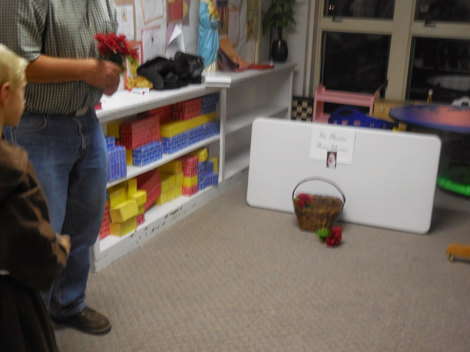 This is the St. Therese's Shower of Roses game. Kids got three bunches of roses for three tries to get the flowers in the basket.