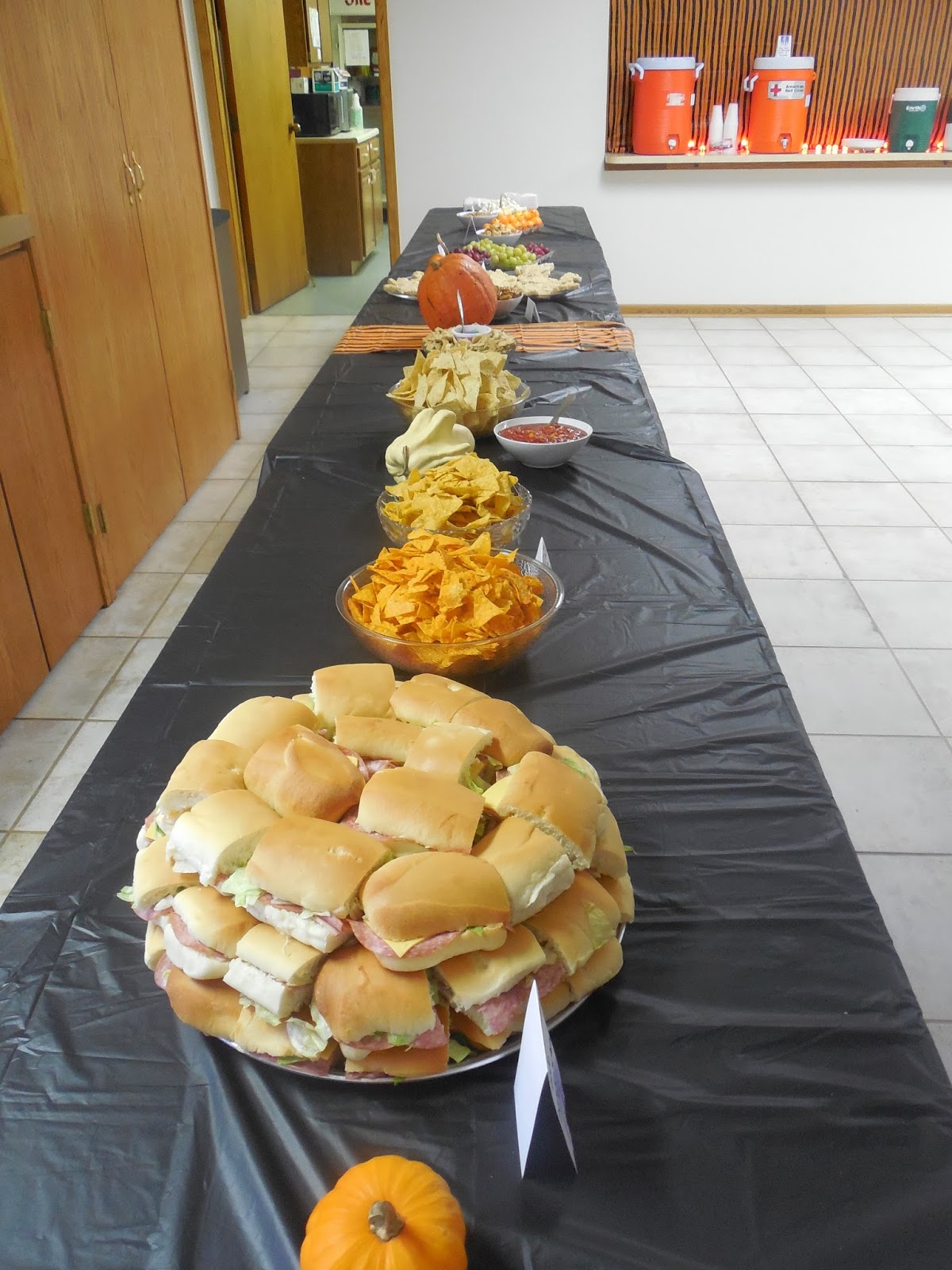 My goal in the decorating was to make the church hall not look like a church hall -where we hold CCD and Coffee & Donuts - but a like a Halloween party.