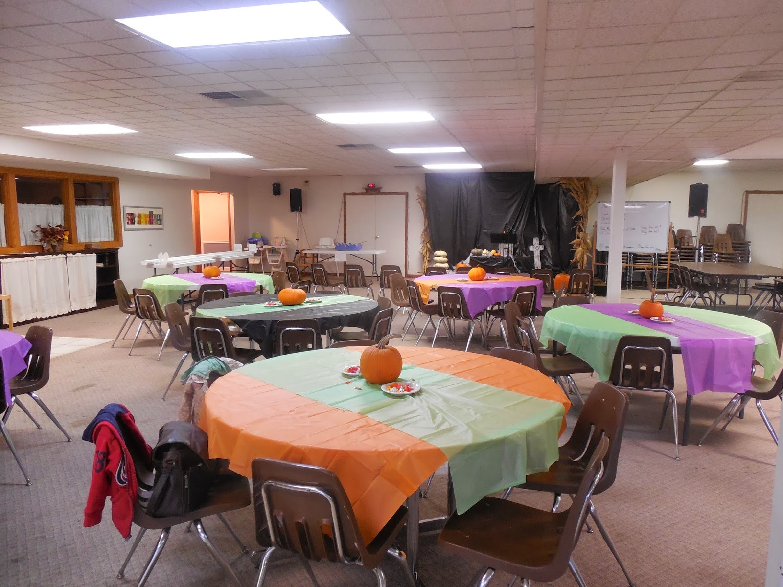 We decorated the tables with more colored plastic tablecloths, more donated pumpkins, and little plates with fall-ish candy.
