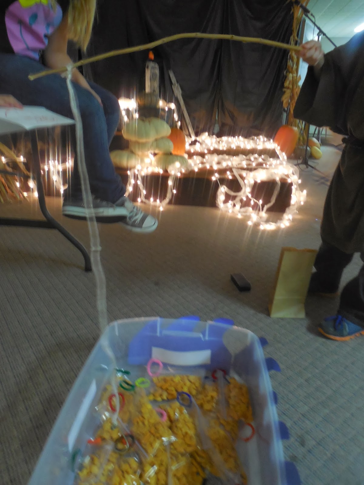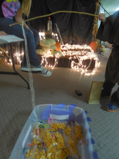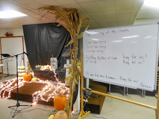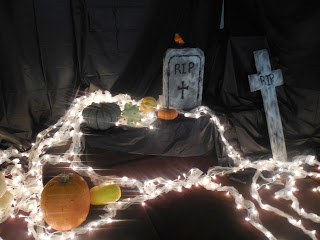 The wanted it to look like a cemetery - where all the saints were speaking - and so I made a couple of tombstones, set up some more of the donated pumpkins, and snaked about some white lights wrapped in tulle. The picture doesn't do it justice - it looked like a fog was rolling through the cemetery and was just the right touch of spooky.