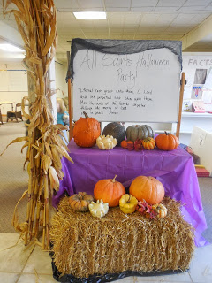 The purple tablecloth was just one of the cheap plastic ones from Wal-Mart. I like how it adds a fun pop of color. The pumpkins and gourds were donated by a local pumpkin farm and picked up the day after Halloween. The white board (decked in a "creepy cloth" that cost $1 at the Dollar Store) reads, "All Saints' Halloween Party" and below it is the prayer, "Eternal rest grant unto them, O Lord, and let perpetual light shine upon them. May the souls of the faithful departed, through the mercy of God, rest in peace."