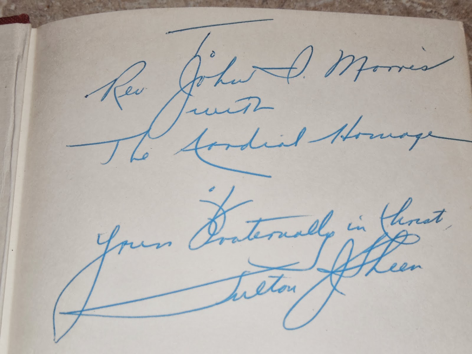 ReplyDeleteTo the Rev. John I. Morris with the cordial homage of Yours Eternally in Christ Fulton J. Sheen