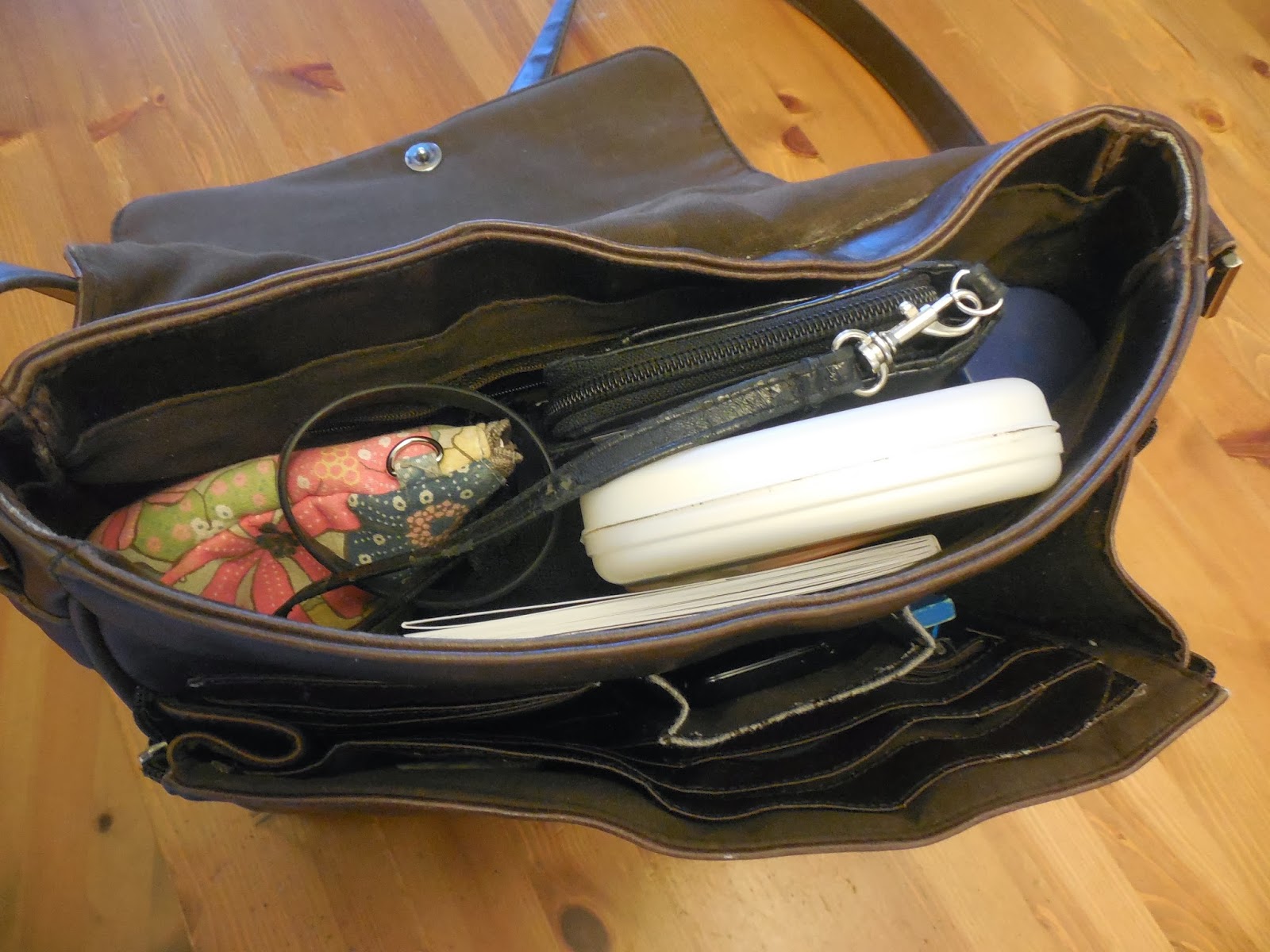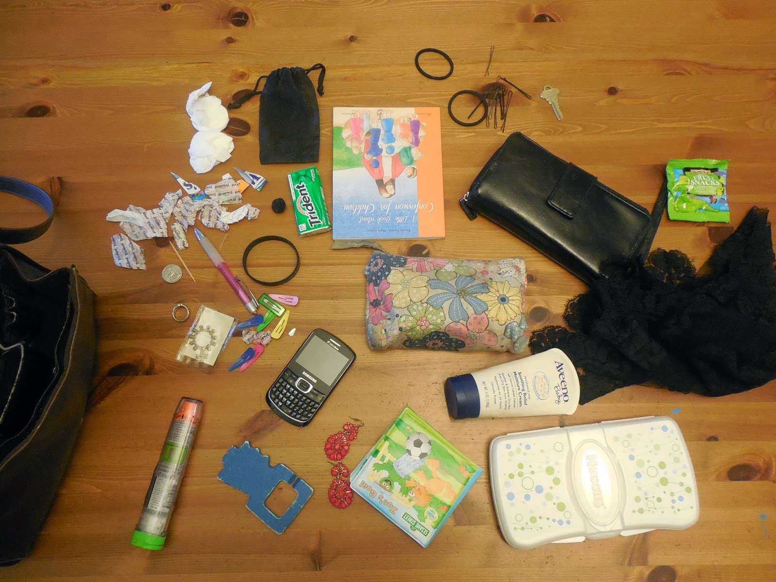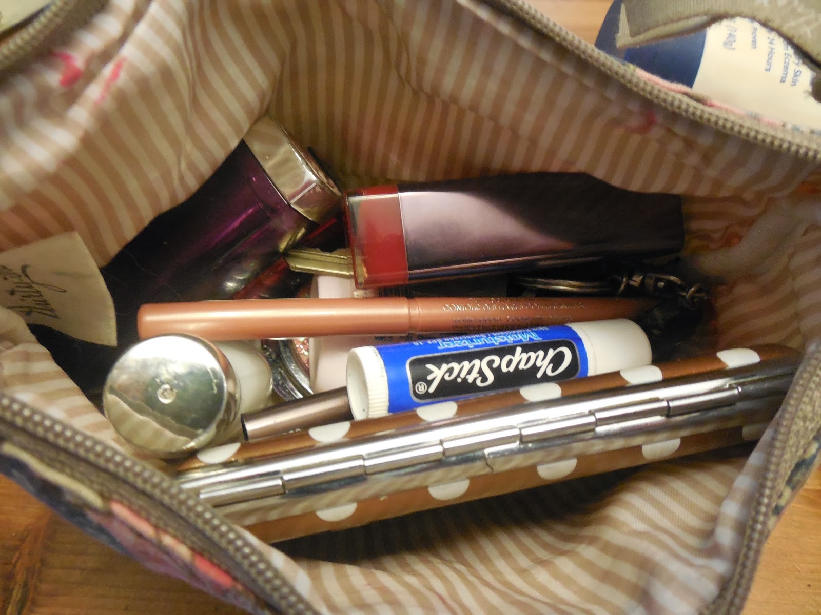 There's my bag o' stuff with business cards, lip liner, keys, nail polish, chapstick, and more.