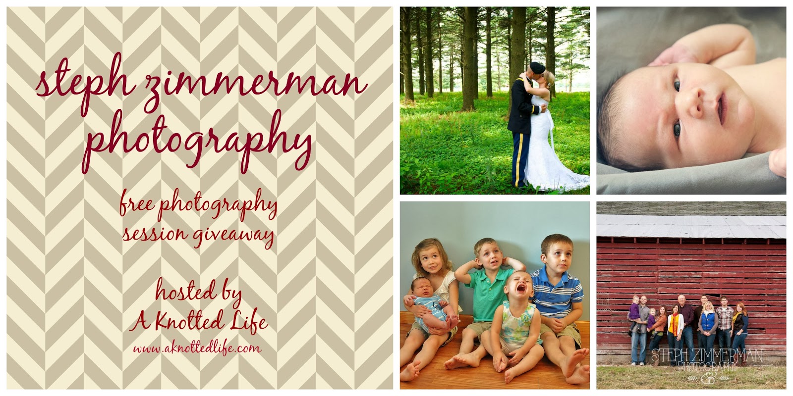Stephanie from Steph Zimmerman Photography is offering a special deal for all A Knotted Life readers and is even throwing in a giveaway for kicks. Steph did family pictures with us last summer and it was great. She is laid back but also knows how to take charge of a situation - which is helpful when you have a newborn and four other kids you're trying to wrangle. I highly recommend Steph and I strongly recommend having family pictures taken so this contest is a no brainer.