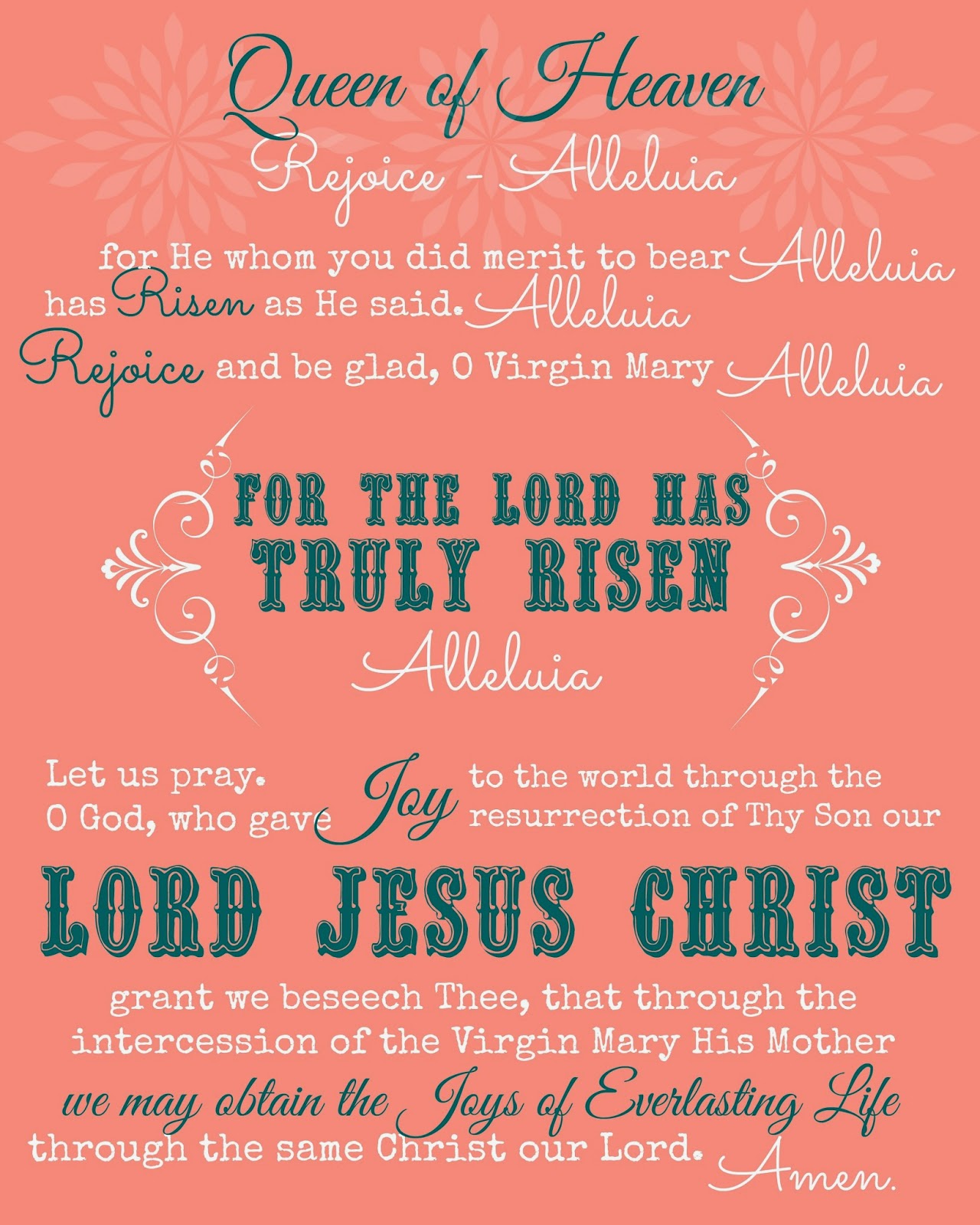 4 - Every day at 6am, 12 noon, and 6pm Catholics have traditionally prayed the Angelus. However, during the season of Easter the Angelus is replaced with the Regina Coeli. I have plans for my next house: in the dining room I want to hang a print of the Morning Offering, then the Angelus or Regina Coeli, and then the Act of Contrition so my family can pray them together at breakfast, lunch, and after dinner. We'll see if we actually do that but it's my goal! Kendra made up a really lovely print of the Morning Offering and Act of Contrition and I decided to try my hand at the Regina Coeli.