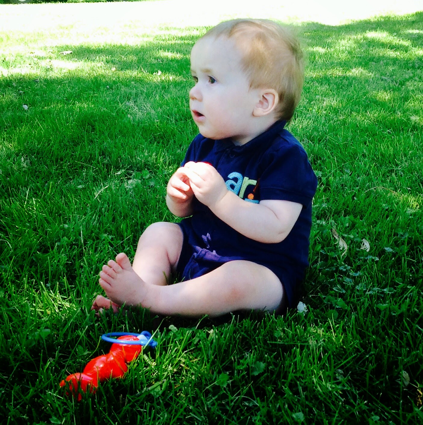 JP is one today. He cruises like a champ, has a fantastic switch-up normal to bear-crawl crawl, and has even taken a few steps. He lays his head on my chest, under the nook of my chin, and will talk to me as we sigh and "ah" and "oh" back and forth.