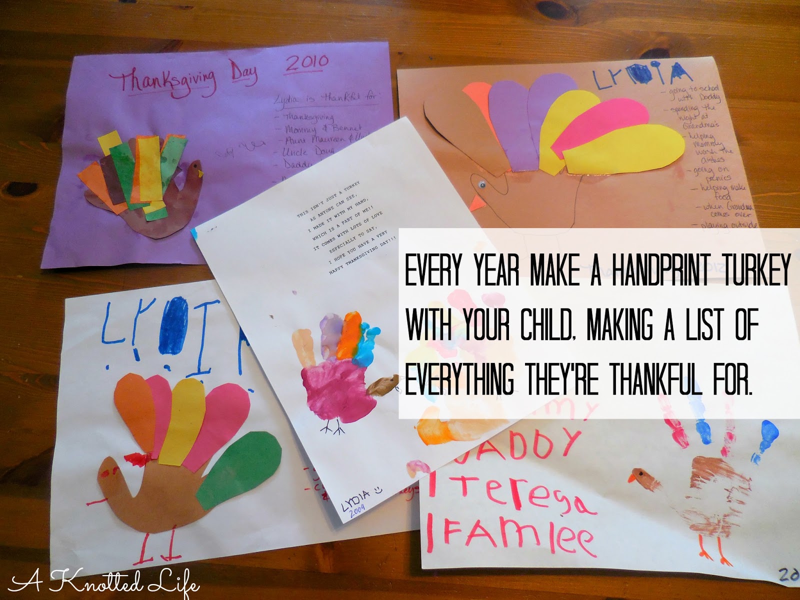 Early in November the kids and I make turkey handprint crafts with a list of all the things they're grateful for. The pictures hang in the house through November and I keep them with the decorations so each year I can reminisce a little as I pull them out of the box.