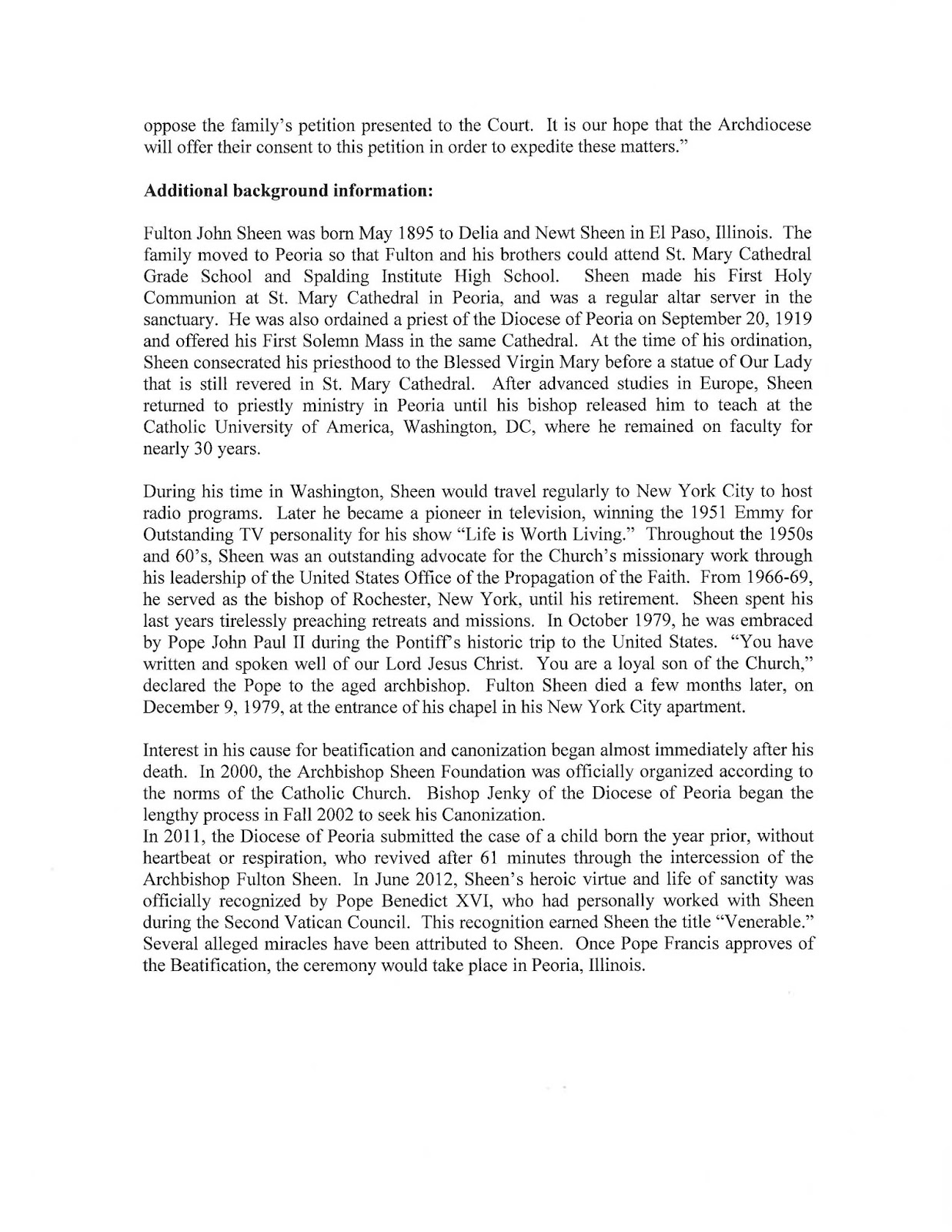 Reading the press release from the Diocese of Peoria, it seems that Venerable Sheen's family became tired of waiting for New York and decided to take matters into their own hands - by petitioning the state's courts for access to their uncle's remains!