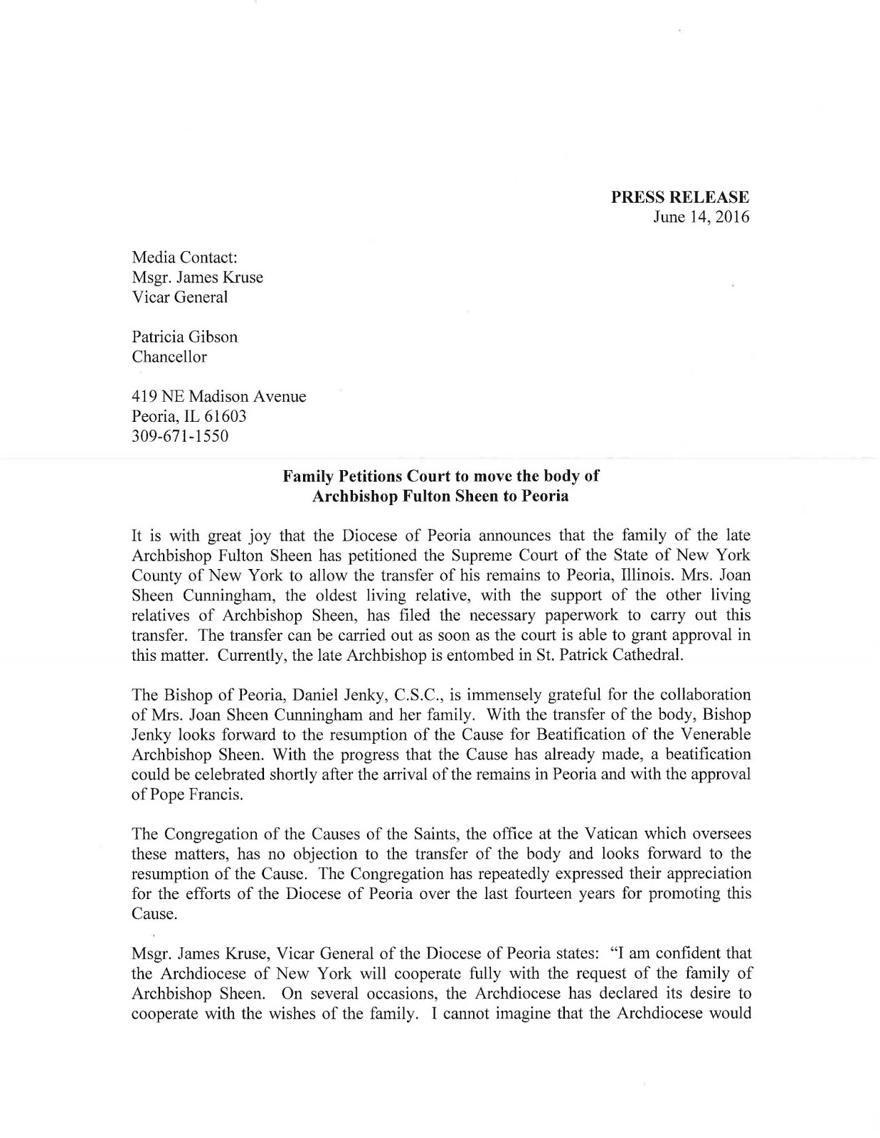 Here's the press release from the Diocese: