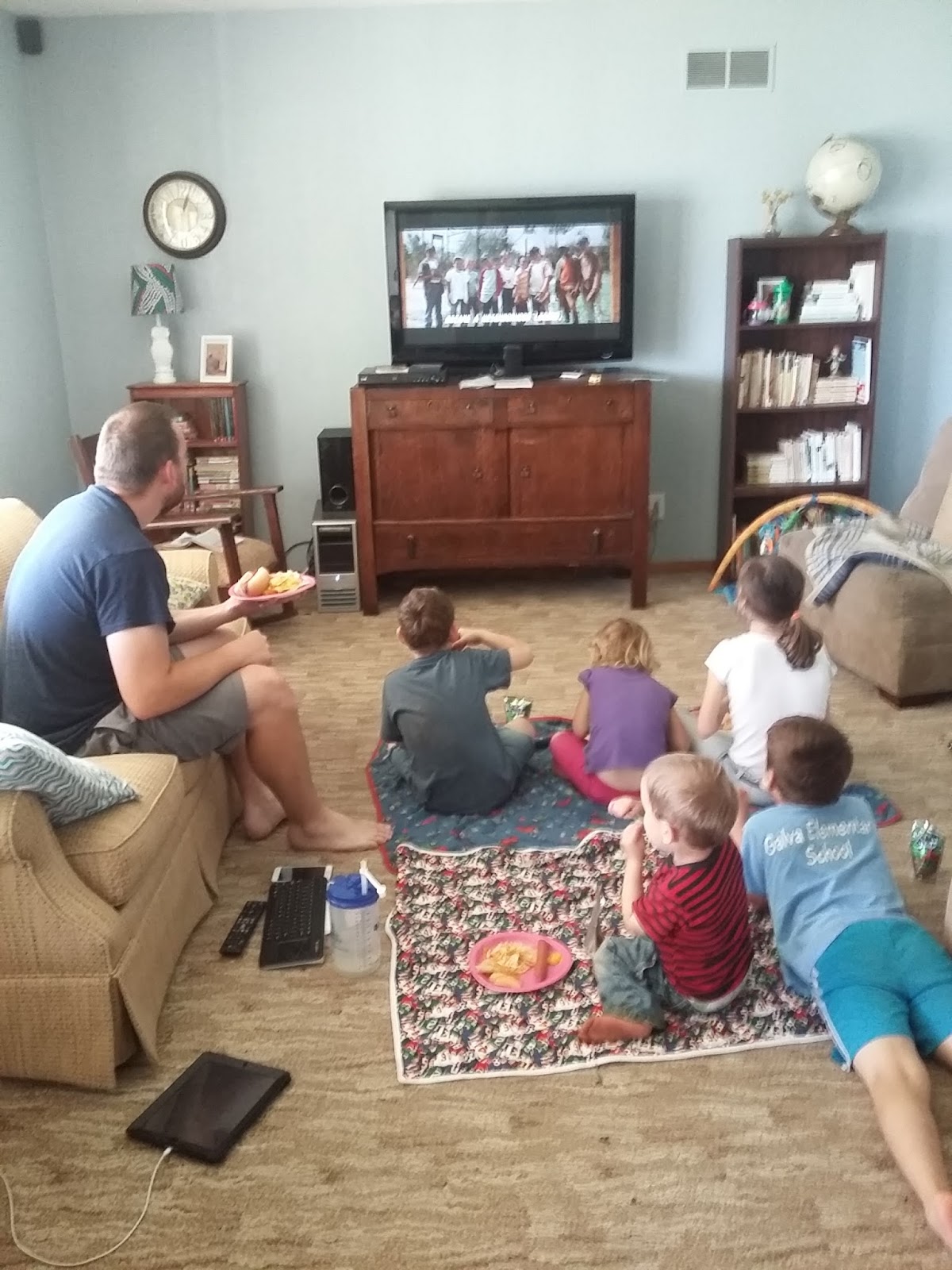 We introduced the kids to The Sandlot. There was a lot more language than we remembered and once JF said, "Oh shit!" and it wasn't because of me I knew I needed to remove it from the Netflix options. But we ate nachos, popcorn, and hotdogs (baseball food) for dinner and had s'mores at just the right time in the movie. ;) The kids loved it.