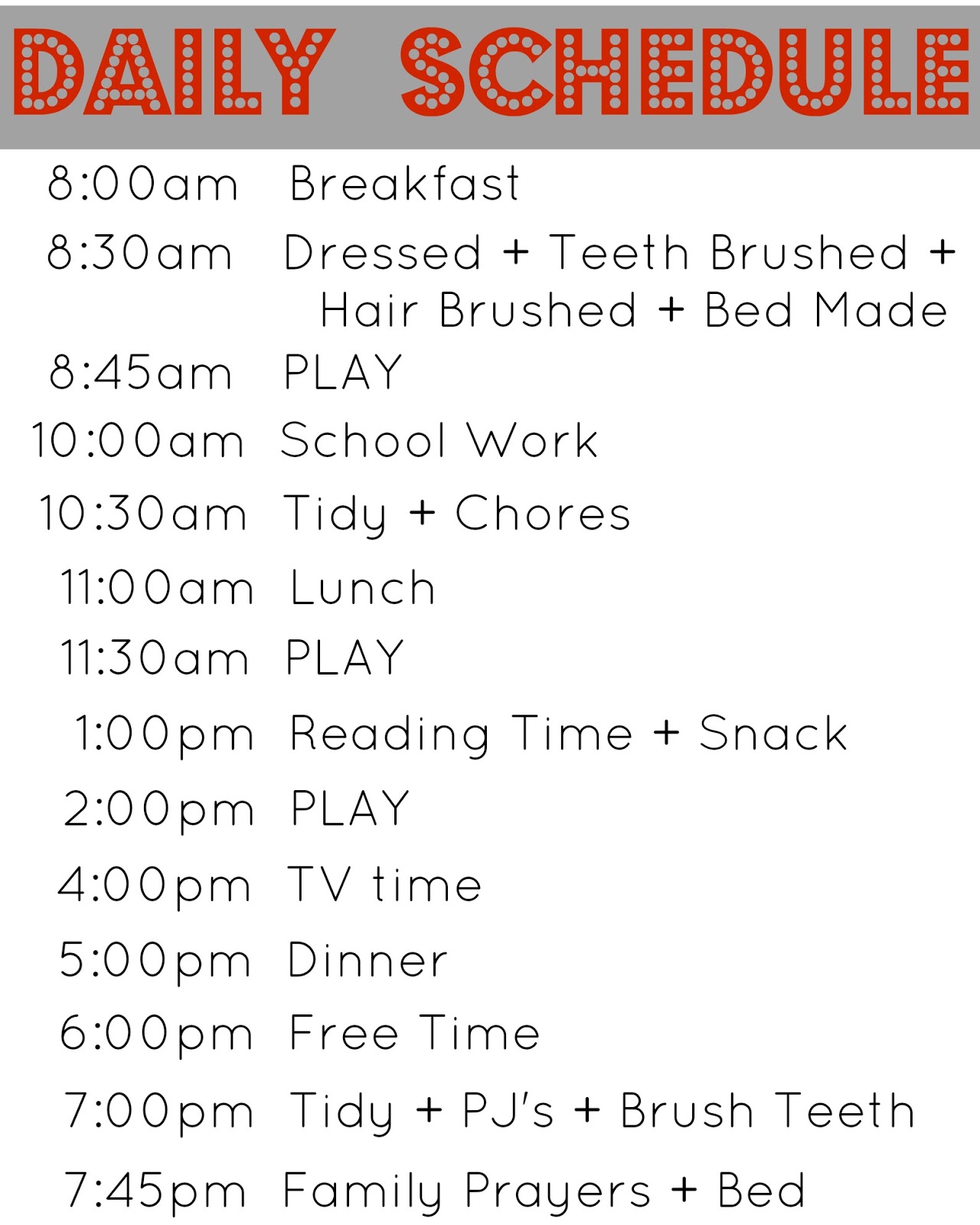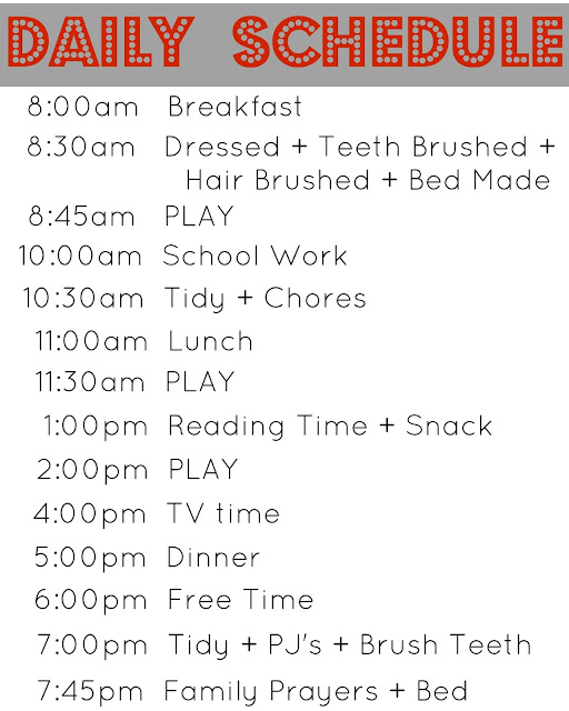 I knew writing out the schedule would mean the kids and I would both have something to reference and keep us all on track. What I didn't know is the amount of authority it would carry in our home. You want to watch TV? Sorry, it's not TV time. You can go outside and play. And they go outside and play! BOOM! Just like that!
