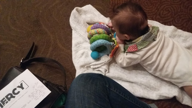 Travis and I attended a Diocesan Institute day that was totally free! My mother-in-law babysat the five older kids and Travis and I had breakfast, lunch, and dinner in between a beautiful holy hour, lessons on Lectio Divina, Mass, and really great presentations by Dan Burke and Peter Howard. Baby Tee got some good tummy time in, too.