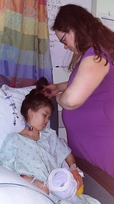 I love this picture of me, 9 months pregnant, brushing L's hair for her and putting it up in a bun as she requested. She was so worn out she fell asleep while I was doing it, but it was so good to have something tangible I could do for her.