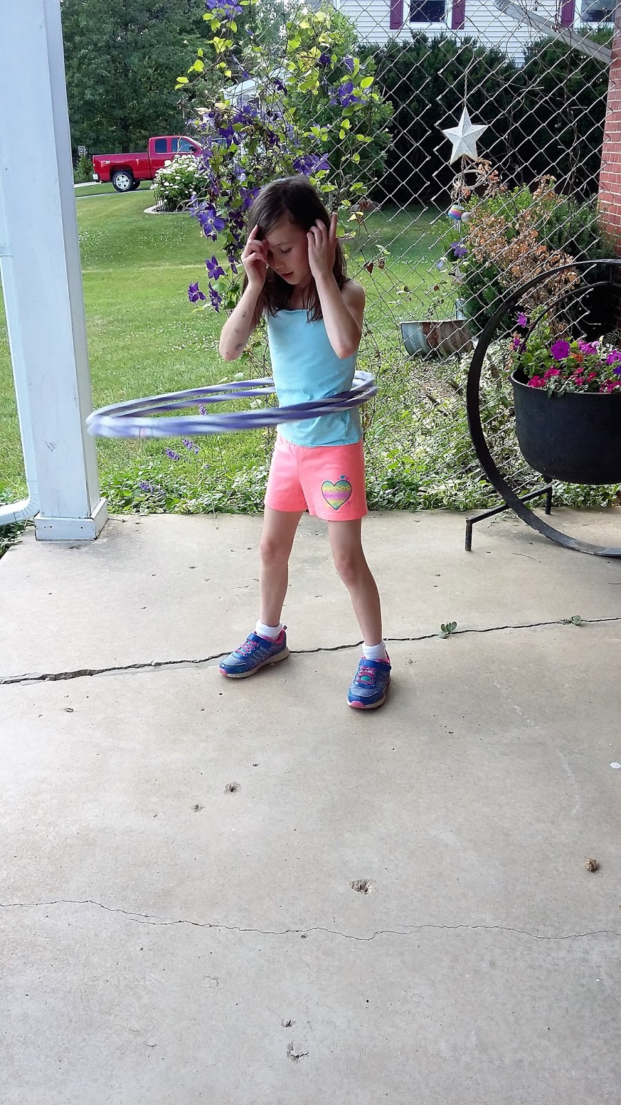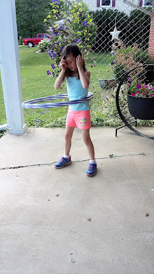 Early on L had a lot of limitations. She mostly napped that first post-op week, took pain meds, and was sore. Many people gifted her with books and crafty things and so she colored, molded, sketched, created, and read. Since she could not lift anything over 5lbs, be in public, or do anything that might lead to a fall she could not run, dance, skip, do stairs, ride her bike, swing high, use the slide, climb anything, attend school or Mass, and so on. But a friend from church dropped off the hula hoops her daughters used to play with - 20 some years ago! - and L became a master hooper! Thank God - literally - that Chris was moved to bring those hula hoops over because they were *just* what L needed - something physical, something new to master, and something that was allowed by the surgeons. Several times a day she'd walk around our house, hooping as she went. She'd hula hoop for minutes - over 8 minutes straight once - and even do the chicken dance while hooping!