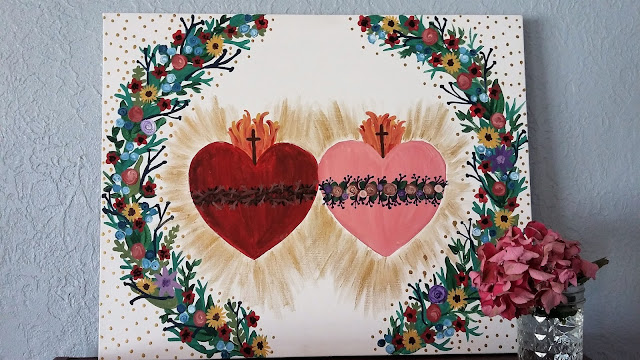 As soon as we shared our news that our eldest daughter, L, had two congenital heart defects and would need open heart bypass surgery people have been awesome. Like "The Body of Christ can move mountains" awesome. Like every dot, flower, and thorn painted with the Sacred and Immaculate Hearts above represents a prayer, a sacrifice, a rosary, a Mass offered up for my daughter, and those are only the ones that were submitted online. But every time we take a long look at that painting I am overwhelmed by the goodness of others and the way God is glorified by your works.