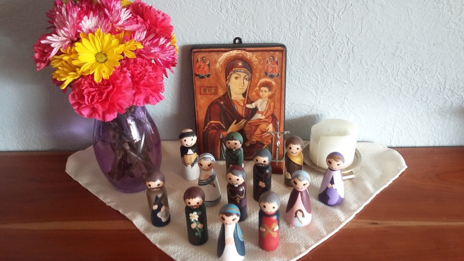 Last year I gathered all our saint peg dolls and lined them up on the buffet aka family altar but this year they're being loaned out to my friend Katie. We'll gather holy cards for this spot instead and pray a litany of family saints at bed time.
