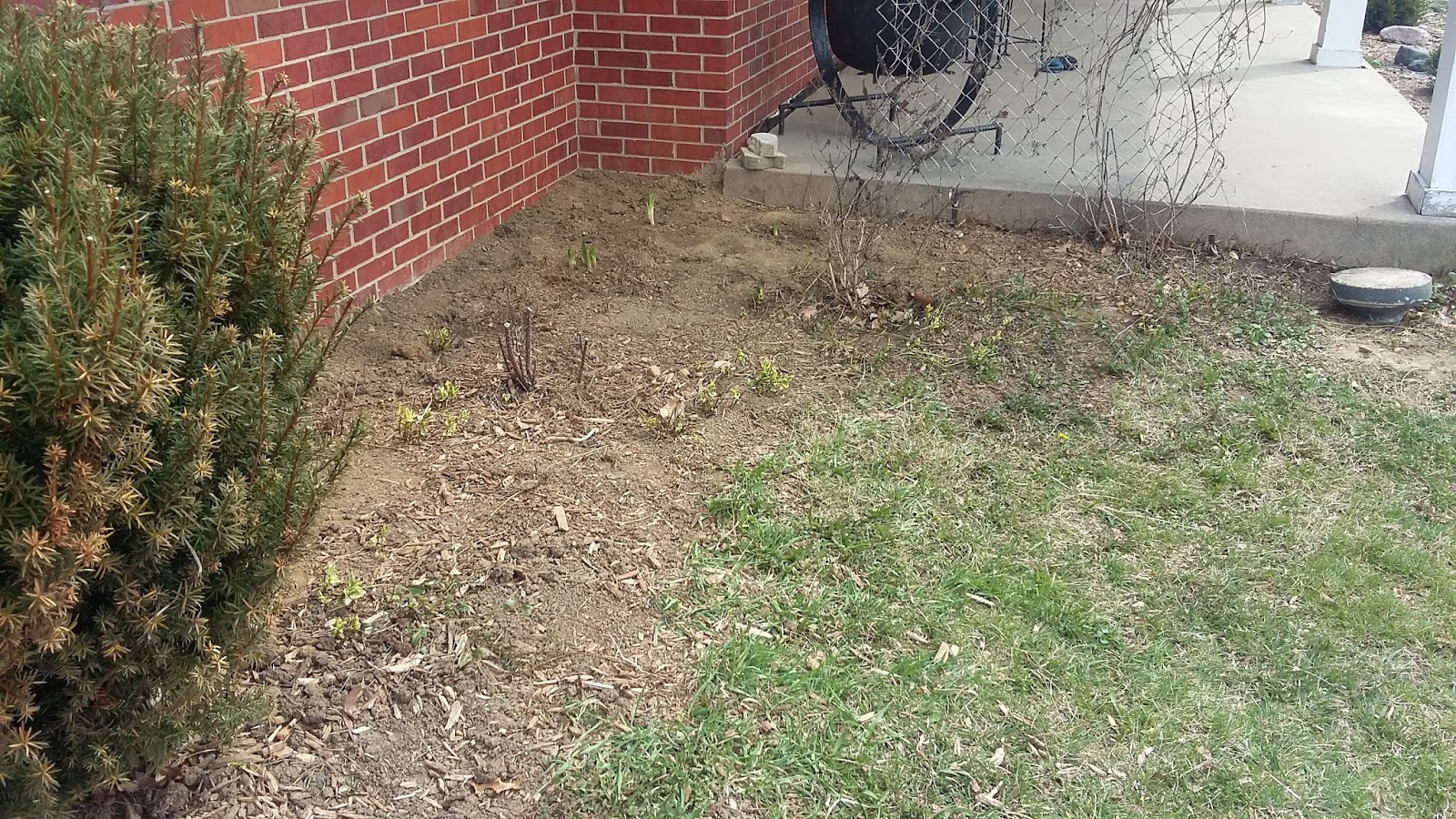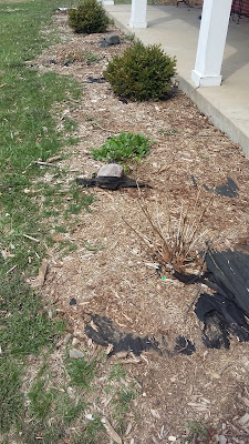 I spent hours making this corner look this good, which seems so incredibly sad looking at the picture, doesn't it? Here I trimmed back the rosebush, shaped the evergreen, cleaned out all kinds of dead, dug up crab grass and weeds, and transplanted some day lilies from another part of the yard. There is a butterfly bush in this corner and clematis grows up the chain link against the porch. I will also plant some zinnia and morning glory seeds in this area. The concrete circle is the bottom of a busted up birdbath that came with the house. I plan to dig it into the earth for a stepping stone since we always step off the porch there. A ground covering takes over this little corner so much mulch isn't needed and eventually the proper stone edging in the front of the house will wrap around to here, too.