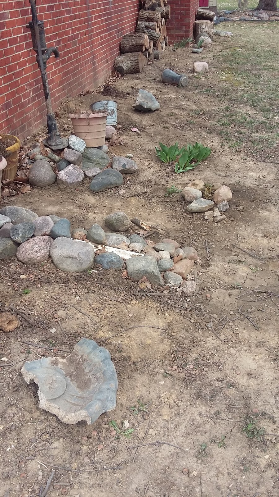 I realize that right now this looks pretty trashy. There's dirt, rocks, and bits of a broken bird bath. But I've got plans, folks. Plan #1 - wait for the hostas, bleeding heart, fern, and peonies to grow in because then it'll look really lovely, which you can see here. Plan #2 - bury half of the bath part of the bird bath in the dirt and then plant impatiens on top. Since the ground slopes away from the house this should create a bit of a berm look. Plan #3 - readjust the pump so it is flat on the ground and redistribute the rocks to other areas of the yard.