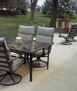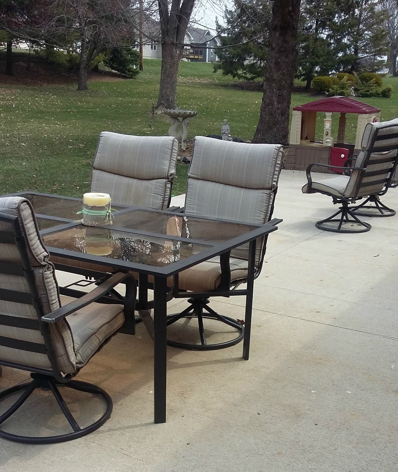 Really our patio is pretty nice but there is a flower bed where the play house and bird bath sit which needs more flowers. We'll see what survived the winter and I think I'll put some cosmos in. Travis has a nice grill tucked back here and we bought a nice, on sale fire pit with gift money that sits by the two chairs. There's plenty of room for the kids to play but we really need to replace the chair cushions. The table and chair set was a hand-me-down - which I am not poo-pooing at all, I am so grateful to have them! - but the cushions are in rough shape.