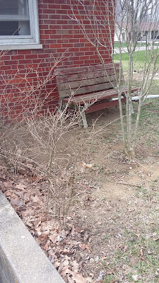 Again, I know this looks pretty bad right now but if things survived the winter after being transplanted last year it will be a very nice spot. There's a couple of bushes that have always been there, the Rose of Sharon we moved, some hostas I put in the area, and I hope to put the hydrangea from the front here. I've been meaning to re-stain that bench for three years but since I actually have the stain already it will get done this year! The kids' climbing tree is nearby this spot and our garden is just around the corner. This little nook is shady and lovely when everything is green, the perfect spot to watch the kids play or take a rest after weeding the vegetable patch.