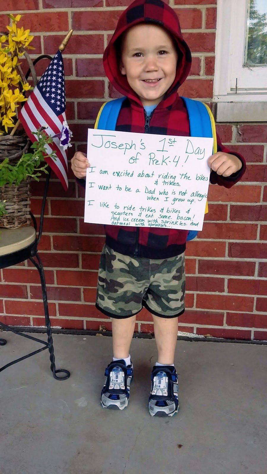 "I am excited about riding the bikes and trikes. I want to be a Dad who's not allergic when I grow up. I like to ride bikes and trikes and scooters and eat. some. bacon! And ice cream with sprinkles and oatmeal with sprinkles."